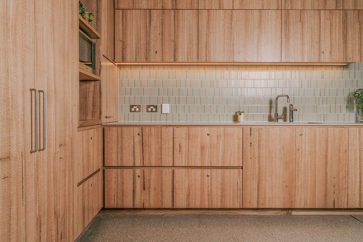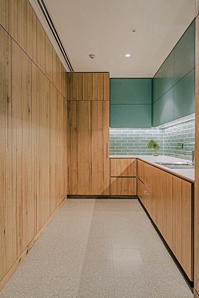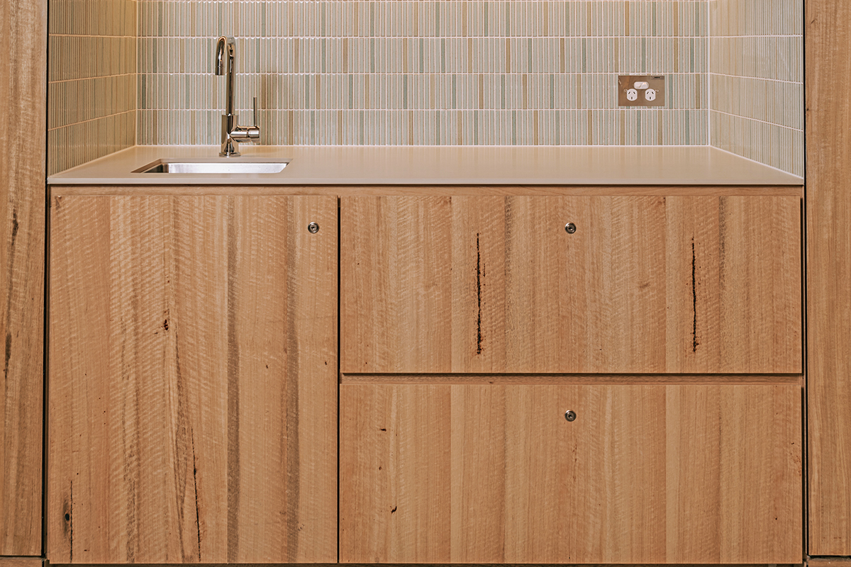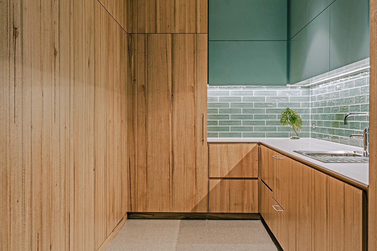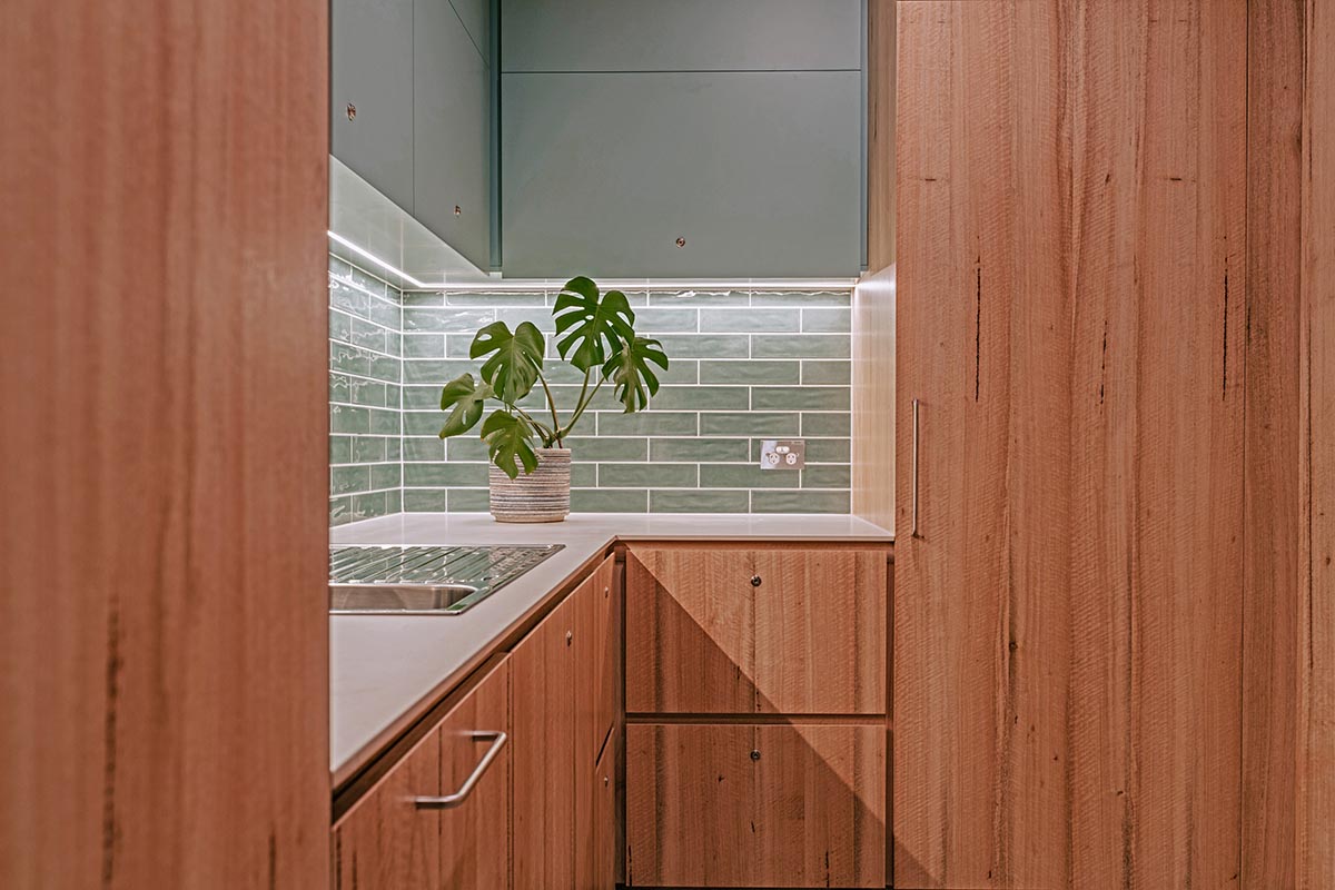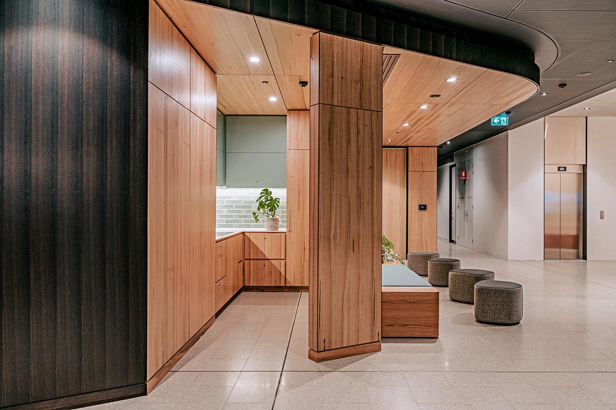 The new Indigenous Studies building provides an exciting learning environment for students in the School of Indigenous Studies and at the Centre for Aboriginal Medical and Dental Health. The building includes informal learning spaces, collaborative learning and spill-out spaces, and a variety of research and postgraduate office spaces. Kitchen @ Quality was contracted to provide and install all the cabinetry and benchtop work, including bespoke natural timber veneer cabinet door, timber veneer wall, terrazzo tiling and benchtop.